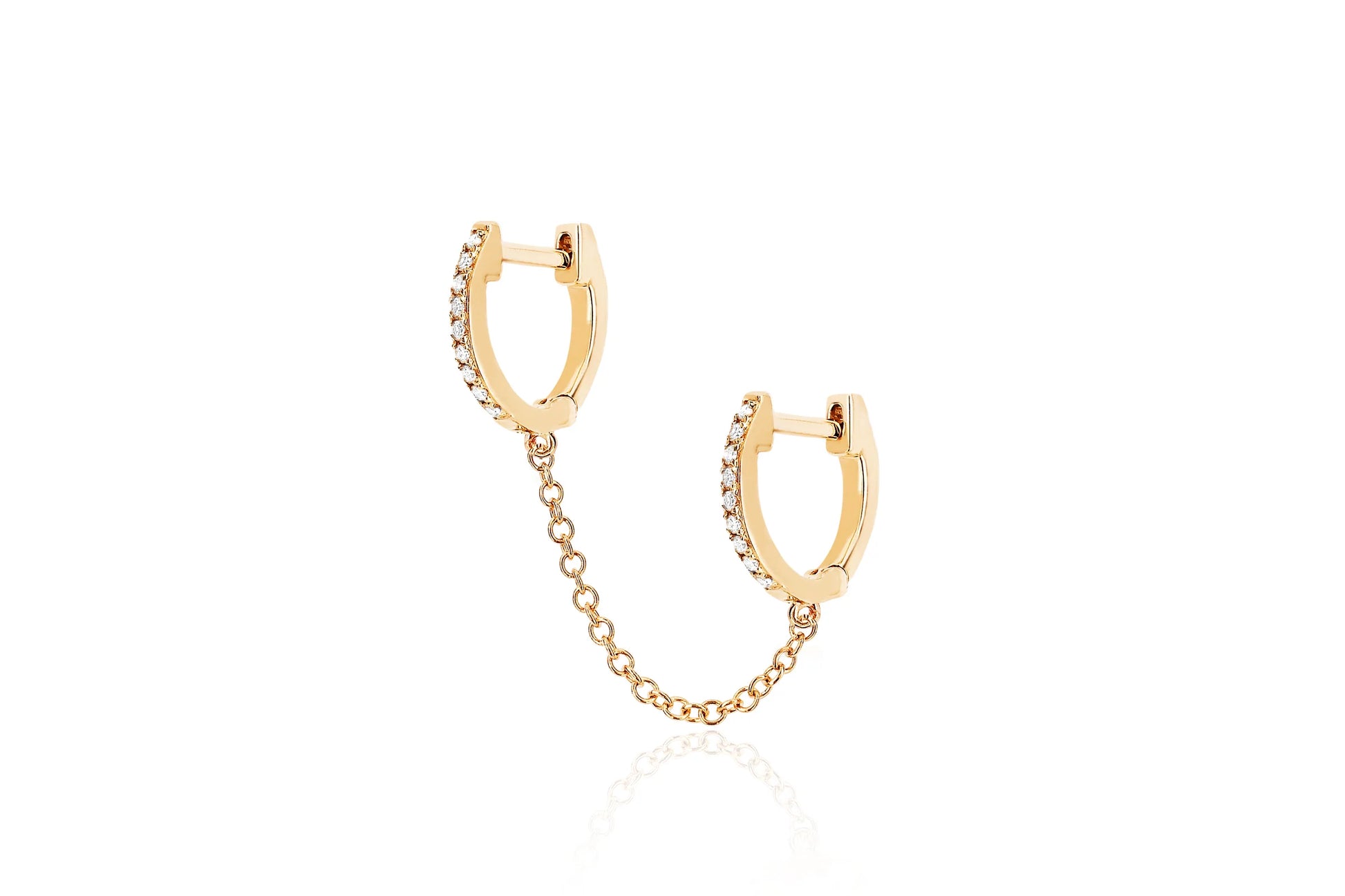 The Diamond Double Mini Huggie Chain Earring features two of EF's best-selling Diamond Mini Huggie Earrings connected by a dainty cable chain. Each huggie fastens into a separate piercing, and looks just as good in the lobe as it does up the ear. Turns out two huggies are better than one.