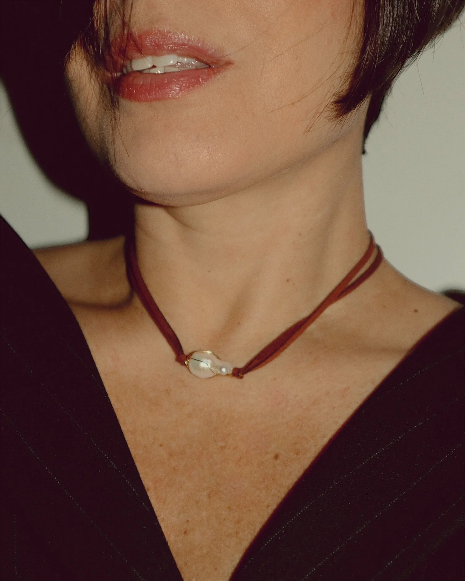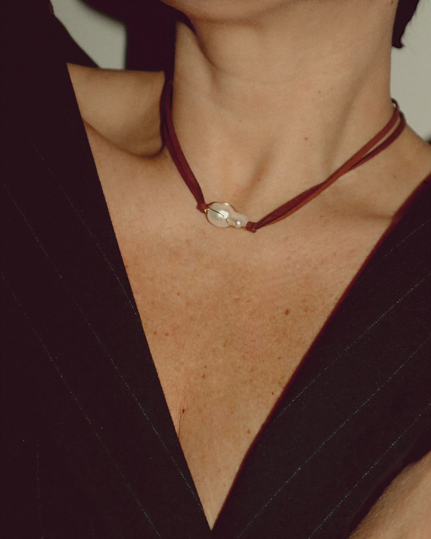 This piece features a luminous, naturally shaped baroque pearl wrapped in gold wire, suspended from rich dark brown leather cords. Wear it knotted, wrapped, or left long — the styling is yours.