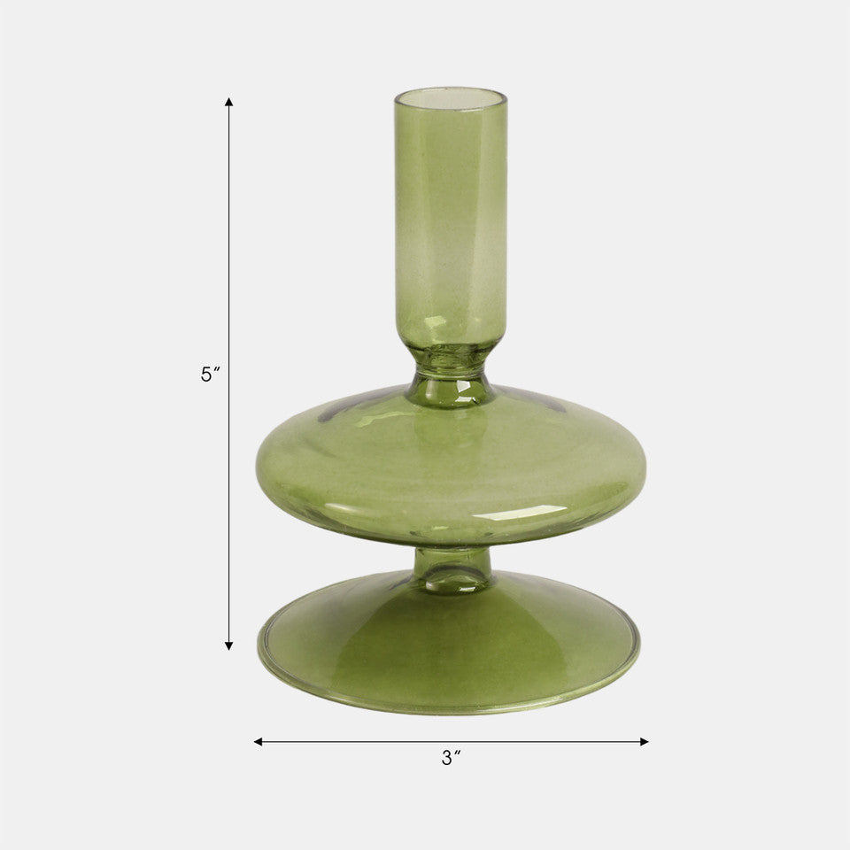 Sculptural and sleek, the Olive Vintage Glass Taper Holder - 6” is the smallest in this curated glass series, designed to layer effortlessly with its taller companions. Its bold, rounded base and luminous green hue bring a playful yet elevated touch to any table, mantle, or shelf. Pair it with the 7” Bubble and 11” Vintage taper holders for a modern, staggered silhouette that captures both balance and contrast.